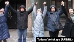 Участники акции были без плакатов, они выстроились вдоль фасада дома живой цепью.